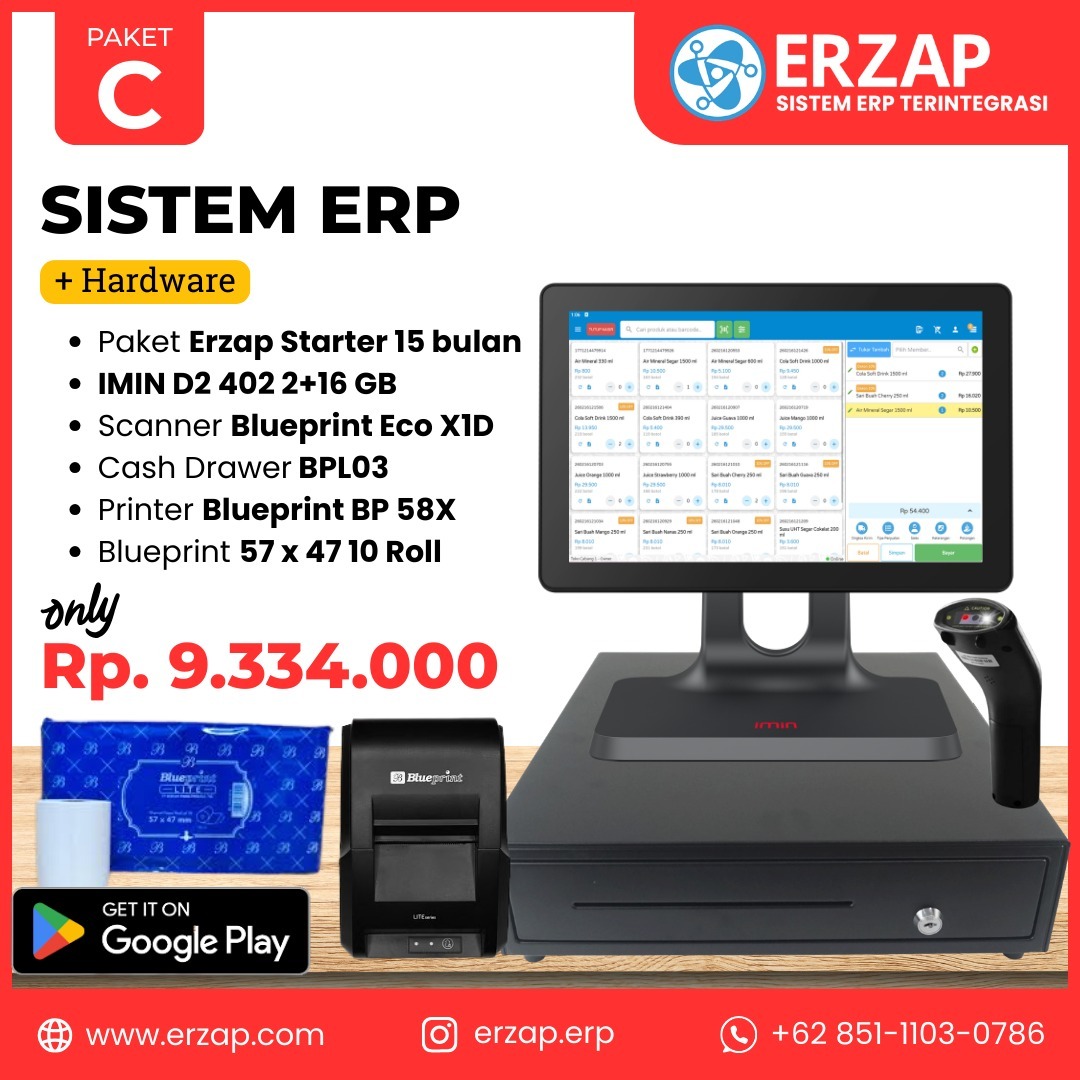Kelola bisnis lebih cepat, rapi, dan profesional dengan Sistem ERP ERZAP yang sudah dilengkapi perangkat kasir siap pakai. Dirancang khusus untuk membantu pelaku usaha Service Center, Retail, Grosir, dan F&B, maupun berbagai jenis bisnis lainnya dalam mengelola transaksi, stok, hingga laporan bisnis secara otomatis dan terintegrasi.