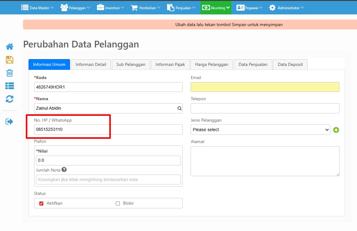 1. Pastikan Nomer HP / WhatsApp Pelanggan sudah tercatat di Management Data Pelanggan
