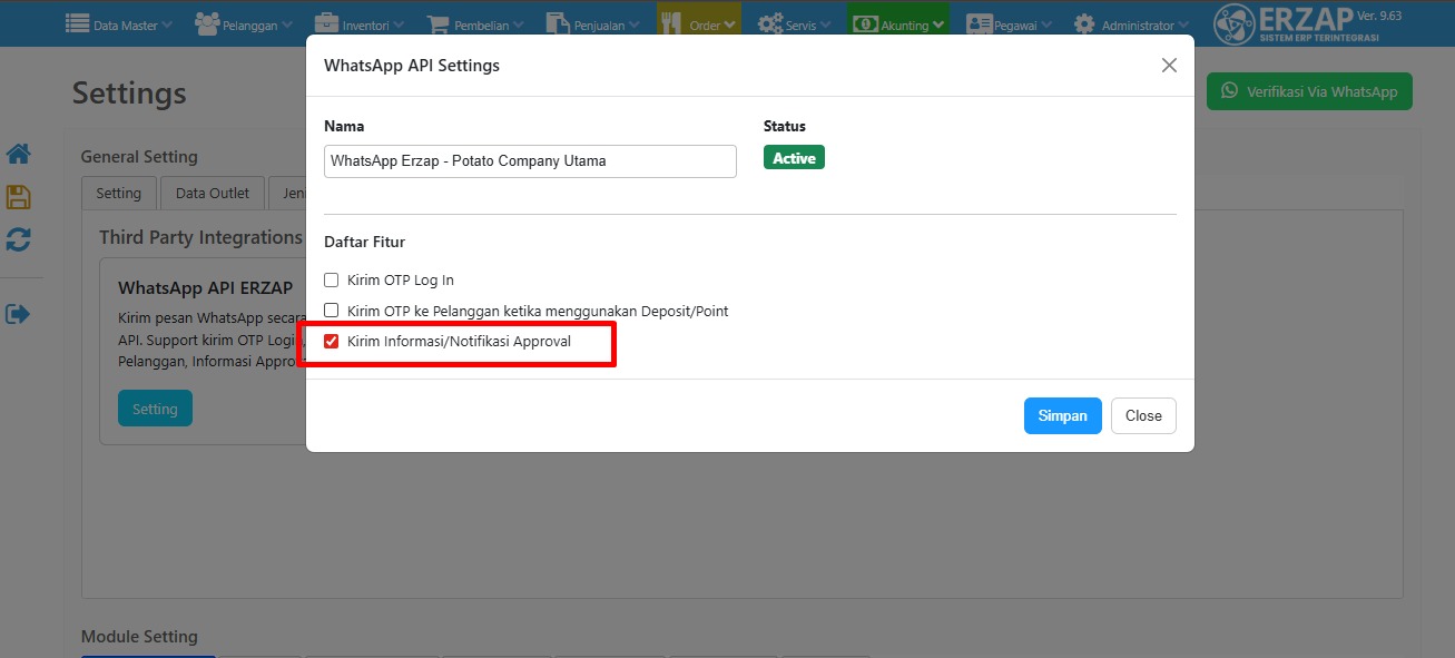 Sebelum melakukan pengaturan aktivasi pengiriman Notifikasi Approval ke WhatsApp,