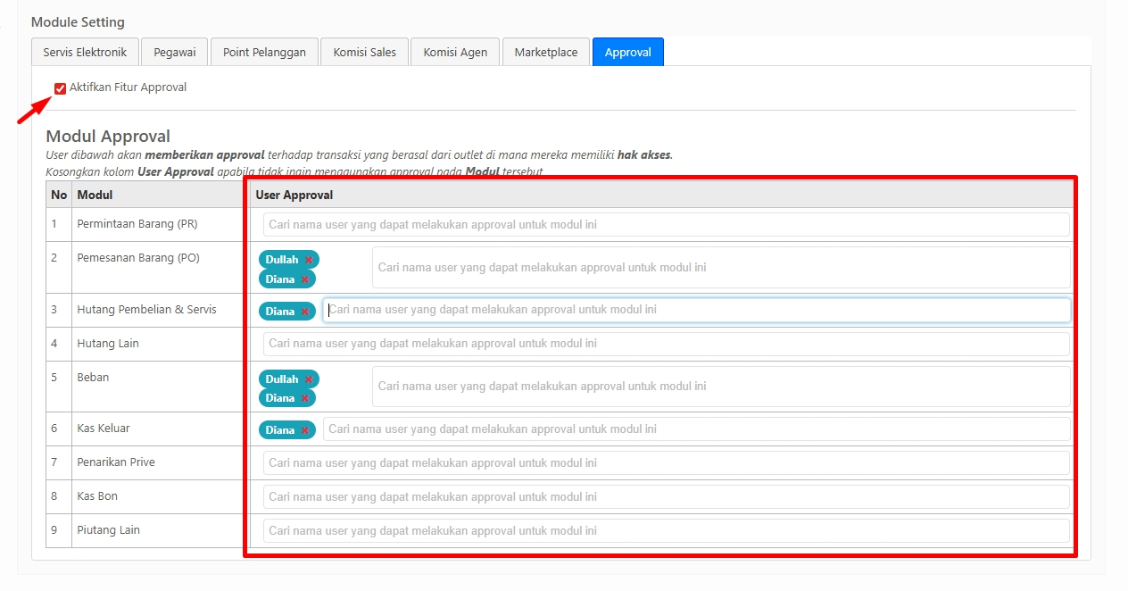 1. Pastikan Fitur Approval sudah Aktif dan User Approval sudah ditambahkan.