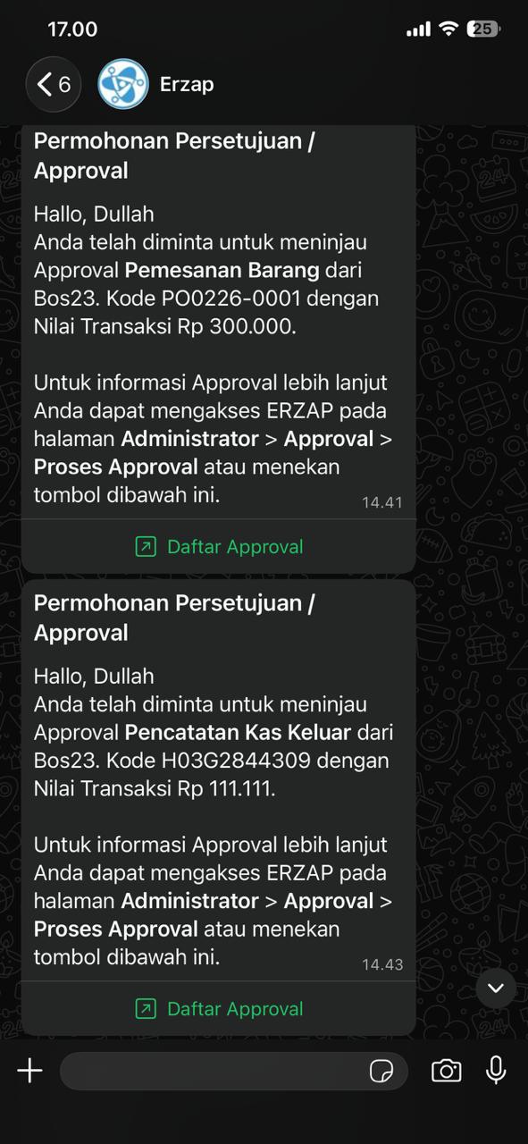 Dengan demikian setiap pengajuan Approval, sistem akan otomatis mengirim pesan Notifikasi ke nomor user yang sudah diset sebagai User Approval