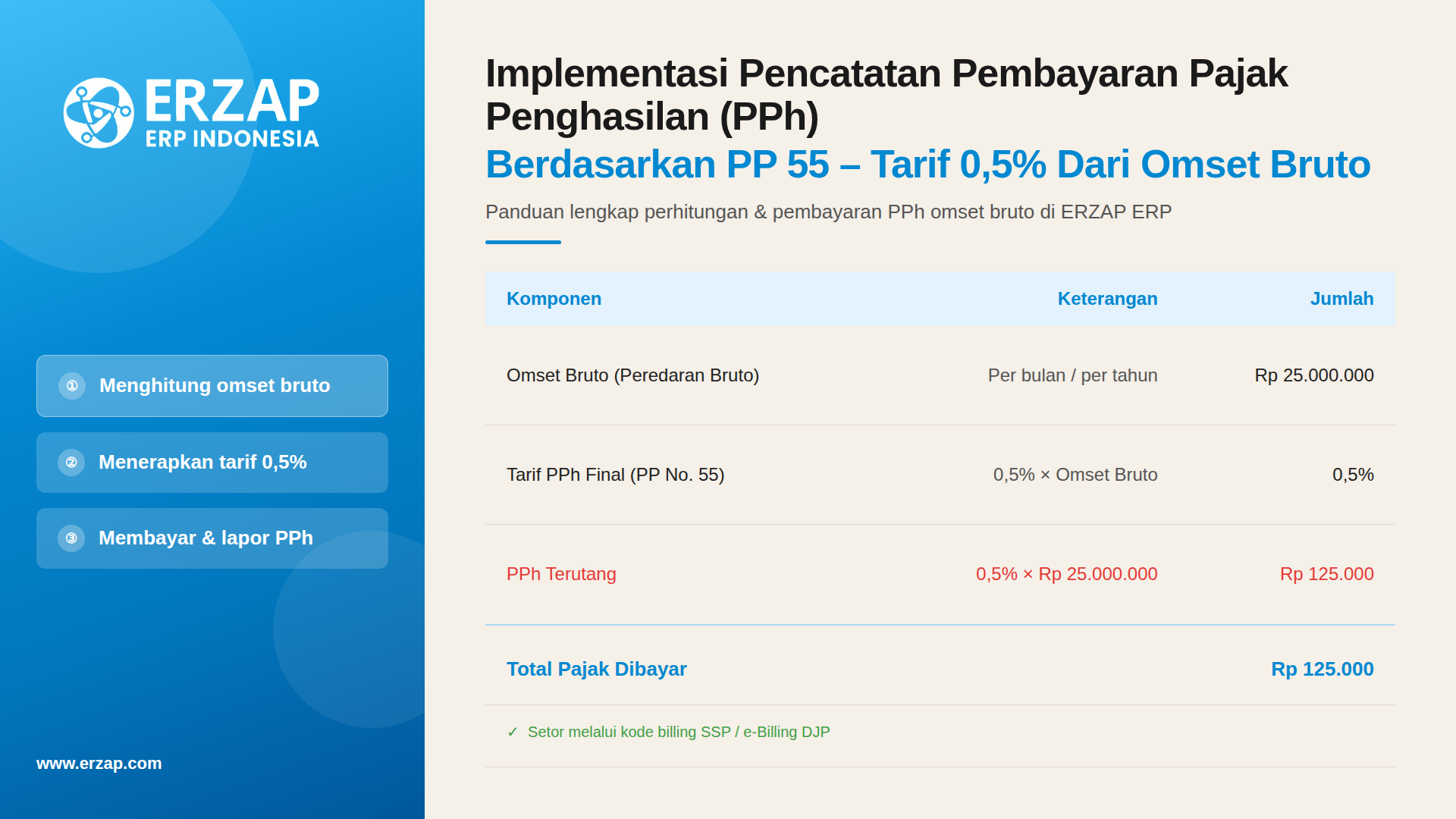 Bagi perusahaan yang menggunakan skema PPh Final berdasarkan PP 55, Pajak Penghasilan dihitung sebesar 0,5% dari total omzet bruto setiap bulan.