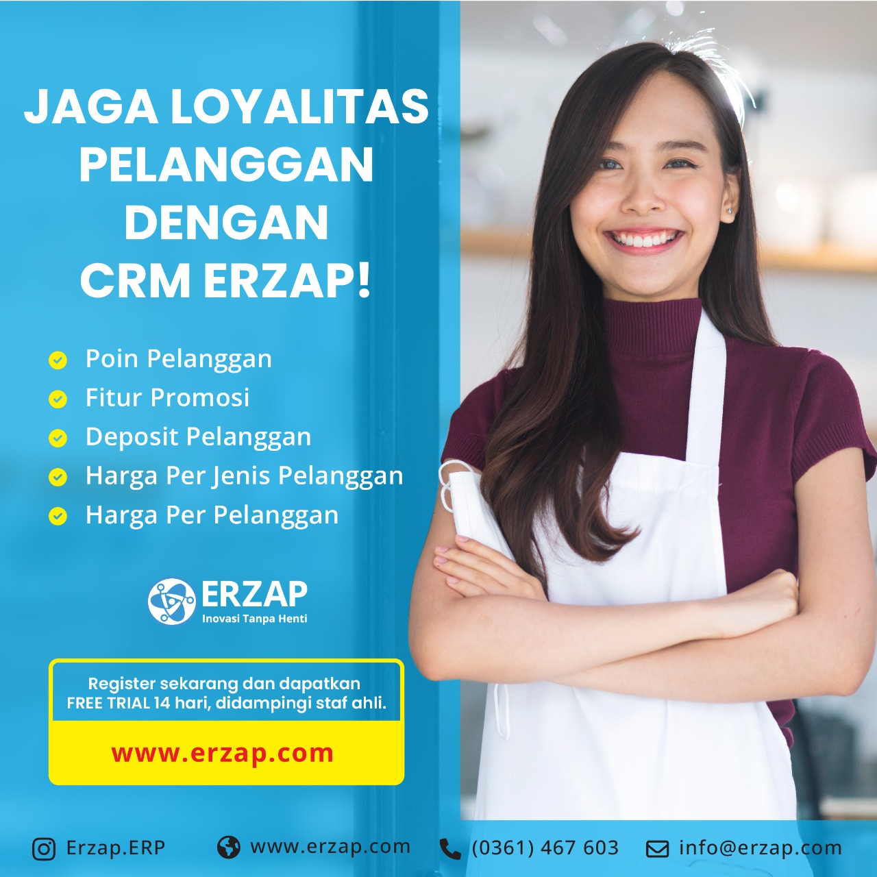Demikian 7 istilah dalam CRM yang sering digunakan. Apabila Anda pernah melihat promosi berupa voucher, gratis ongkir, diskon, poin, dan sebagainya, kegiatan tersebut adalah strategi perusahaan dalam mengelola CRM-nya. CRM sangat penting bagi sebuah bisnis mengingat target akhir dari perusahaan adalah konsumen. Modul Pelanggan dari ERZAP dapat membantu Anda mengatur CRM agar loyalitas konsumen meningkat dan penjualan pun juga bertambah pesat. Ini dia beberapa fitur CRM ERZAP yang dapat mempermudah Anda.
