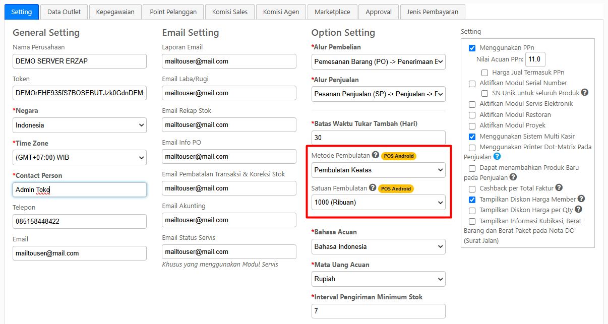 Anda dapat mengatur Metode dan Satuan pembulatan melalui menu Administrator - General Setting, masuk pada tab Setting seperti gambar berikut,