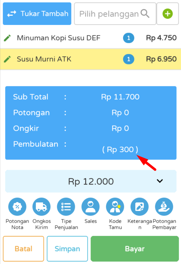 Total transaksi selalu dibulatkan naik ke kelipatan satuan.