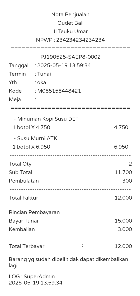 Berikut adalah Nota yang dihasilkan dari transaksi diatas, terdapat informasi pembulatan sebelum Total Faktur.