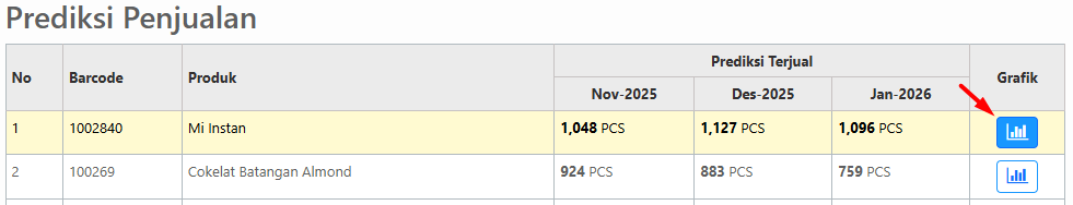 Dengan tampilan ini, Anda bisa melihat tidak hanya prediksi di masa depan, tetapi juga bagaimana data tersebut dihasilkan dari performa penjualan historis, sehingga membantu Anda membuat keputusan stok dan pemasaran yang lebih terinformasi.