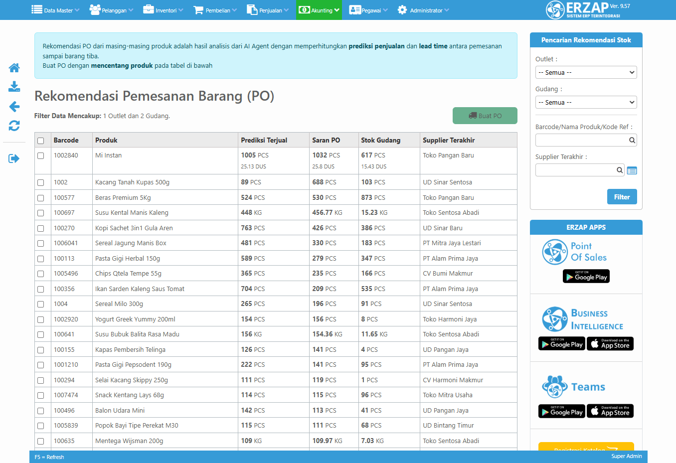 Di sisi kanan, terdapat filter pencarian yang memungkinkan Anda menyaring rekomendasi berdasarkan outlet, gudang, supplier, atau barcode produk tertentu. Anda juga bisa langsung membuat PO dengan mencentang produk yang dipilih dan mengklik tombol "Buat PO" di bagian atas.