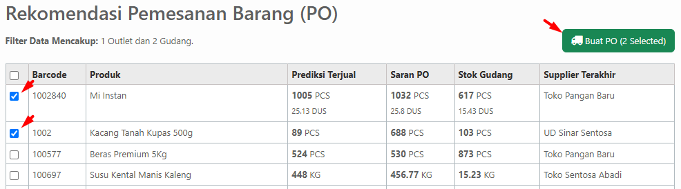 Pada Rekomendasi Pemesanan Barang (PO), Anda dapat memilih produk mana saja yang ingin dipesan. Caranya, cukup centang kotak di samping produk yang Anda pilih. Sistem AI akan secara otomatis menghitung berapa banyak produk yang Anda centang. Pada gambar ini, produk "Mi Instan" dan "Kacang Tanah Kupas 500g" telah dipilih.