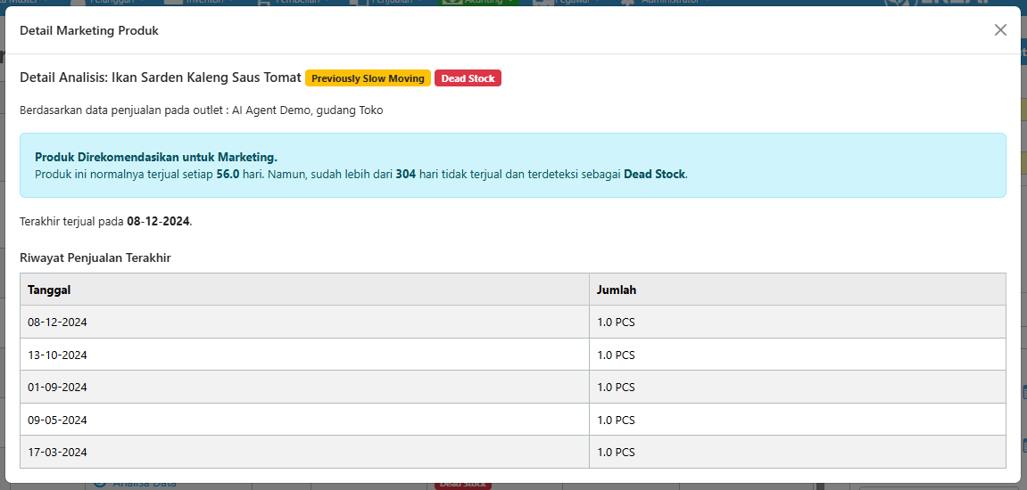 Pergerakan Produk: AI Agent mengklasifikasikan setiap produk menjadi beberapa kategori. Keterangan ini juga mencakup riwayat pergerakan produk, contohnya "Previously Slow Moving" atau "Previously Normal Moving" sebelum akhirnya terdeteksi sebagai Dead Stock.