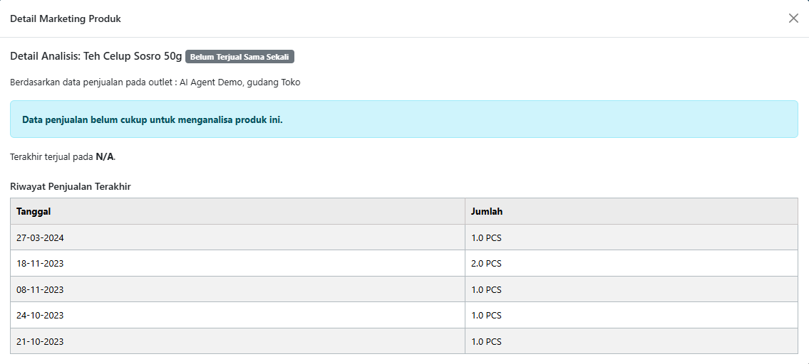 Meskipun riwayat penjualan terakhir ditampilkan, data tersebut berasal dari tahun lalu (2023 dan awal 2024). Karena tidak ada penjualan baru dalam jangka waktu yang cukup lama, sistem AI menganggap data ini tidak relevan untuk melakukan analisis terkini. Oleh karena itu, AI menempatkan produk ini dalam kategori "belum cukup data" untuk menunggu riwayat penjualan baru yang dapat digunakan untuk prediksi dan klasifikasi pergerakan produk.