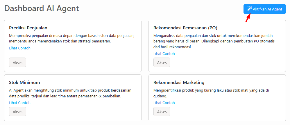 AI Agent secara otomatis menghitung stok minimum ideal untuk setiap produk. Perhitungan ini didasarkan pada data prediksi penjualan dan waktu tunggu (lead time) antara pemesanan dan pembelian. Klik tombol "Akses" untuk melihat bagaimana fitur ini dapat membantu Anda menghindari kehabisan atau kelebihan barang
