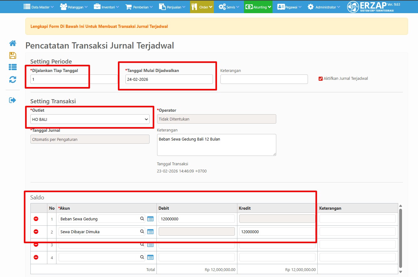 Melalui sistem ERZAP ERP, proses ini dapat dilakukan dengan rapi dan otomatis menggunakan fitur Jurnal Terjadwal.