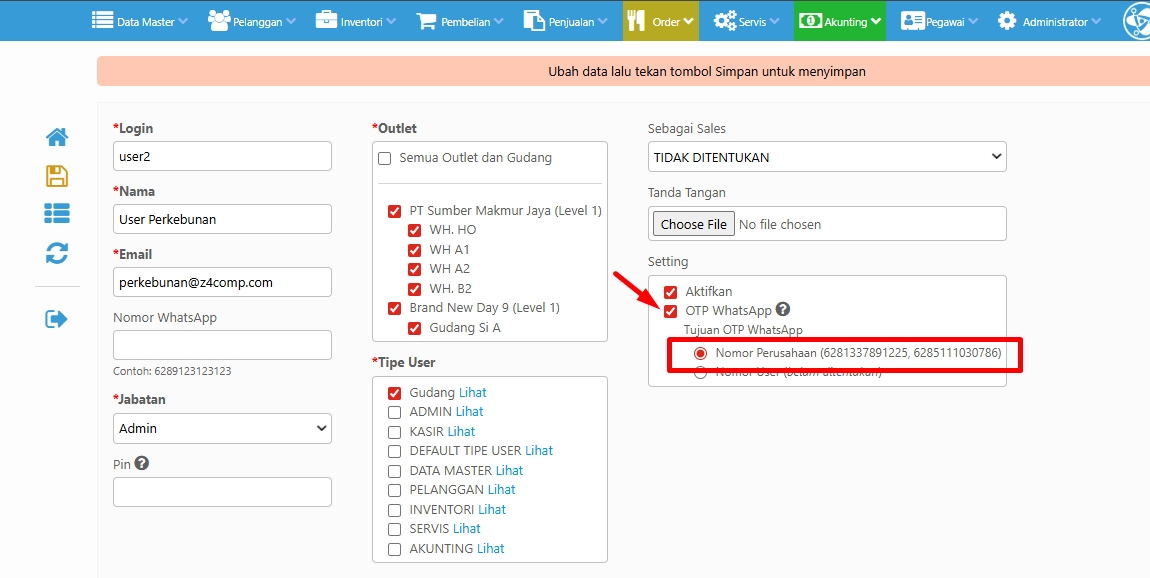 Berikut langkah-langkah pengaturannya aktivasi kirim kode OTP Log in ke Nomor Perusahaan di sistem: