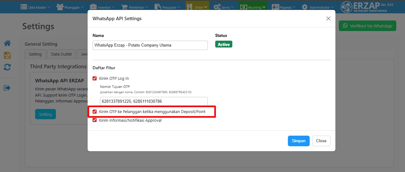 Fitur Kirim Kode OTP Penggunaan Deposit atau Point ke Nomer WhatsApp Pelanggan menggunakan WhatsApp API bertujuan sistem mengirimkan kode OTP otomatis ke Nomor WhatsApp Pelanggan saat akan digunakan di modul Faktur Penjualan, POS, dan Tukar Point.